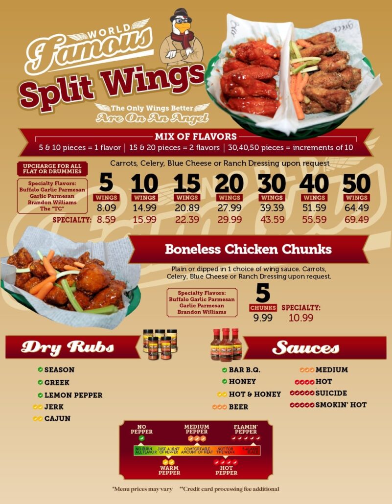 The only wings better are on an angel. Served with carrots, celery, blue cheese or ranch upon request. Upcharge for all flats or drummies.